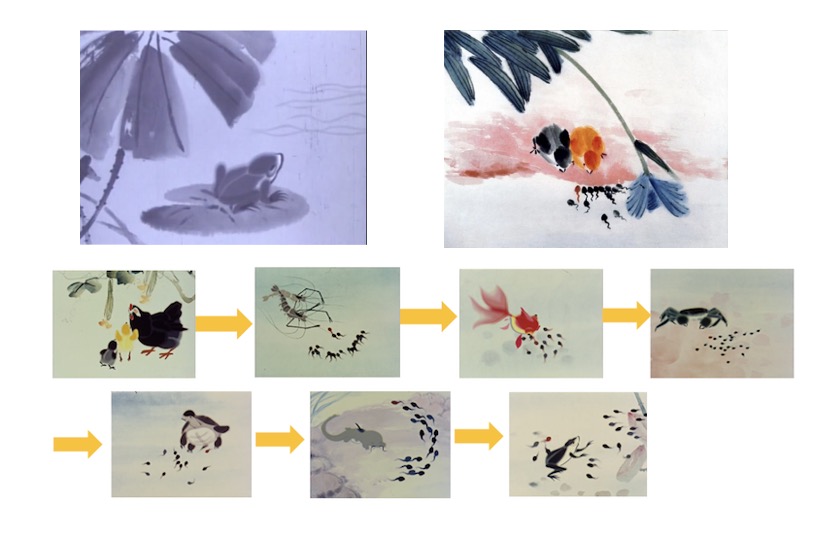 The initial inspiration for making animation is interesting. In 1945, Animator ADa (Xu Jingda) saw a shrimp painted by Qi Baishi at the bottom of a water basin. This inspired him to make ink paintings move! The studio manager, Tevye, was very interested in his idea, so the studio tried to create the first experimental animation – Froggy jumping in the water. After the Test’s success, they were divided into several groups to produce clips of tadpoles meeting different animals, so the first ink animation appeared. In addition, all the animals in the film are from the works of Qi Baishi, a great ink painting artist.